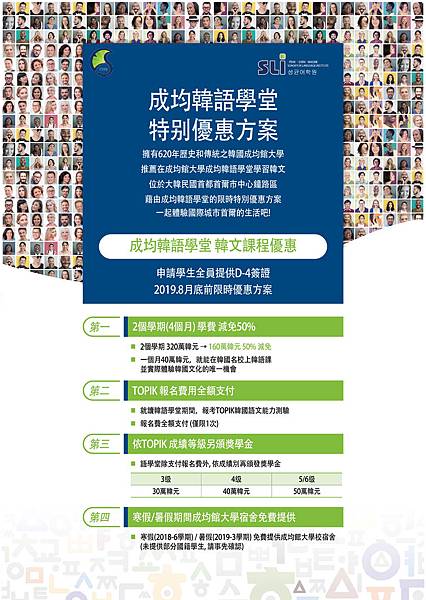 其實在看到簡章前一直有想去韓國讀語學堂的計畫,原先想讀外語大語學堂,但成均館的廣告實在打很大,畢竟學費半價真的很吸引人阿。