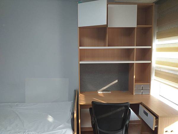 書桌櫃子很多,可以放很多東西,書桌靠近窗戶,邊讀書還能邊看夜景。