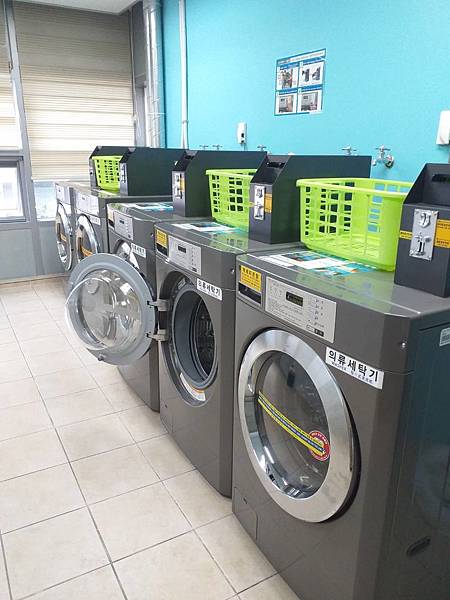 一樓有附設投幣洗衣機以及烘衣機,洗完衣服旁邊也有熨斗可以使用,也有販賣一包500韓元的小包洗衣粉。