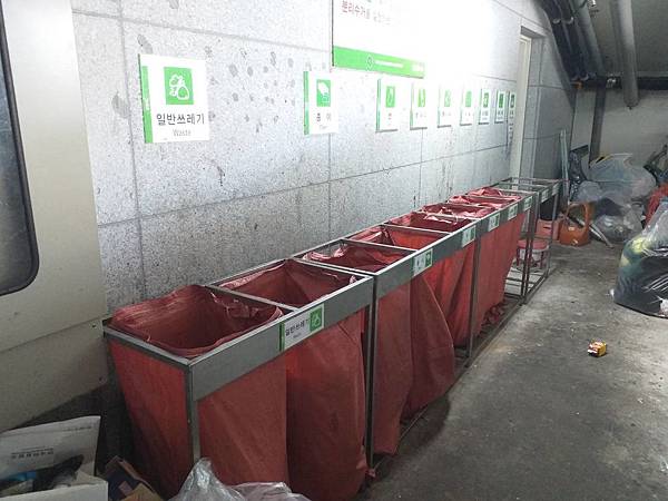 別館和本館之間的停車場則是丟垃圾的地方,房間垃圾須自行拿到這裡來分類,覺得最神奇的地方是,有分衣服和鞋子的回收區。